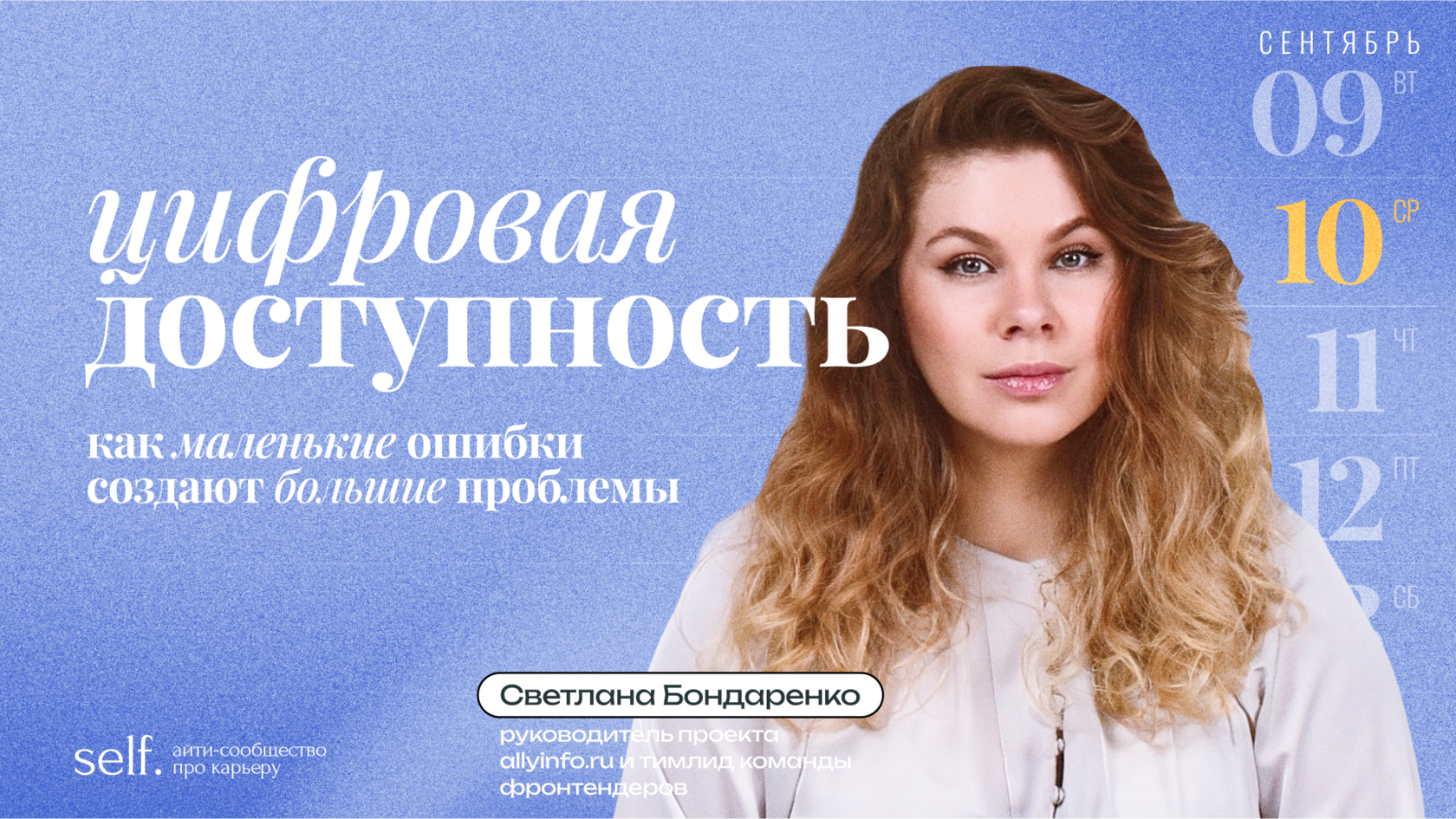 ⚡ Светлана Бондаренко, руководитель проекта allyinfo.ru и тимлид команды фронтендеров, расскажет нам все о мире цифровой доступности и как она влияет на жизни людей. ⚡