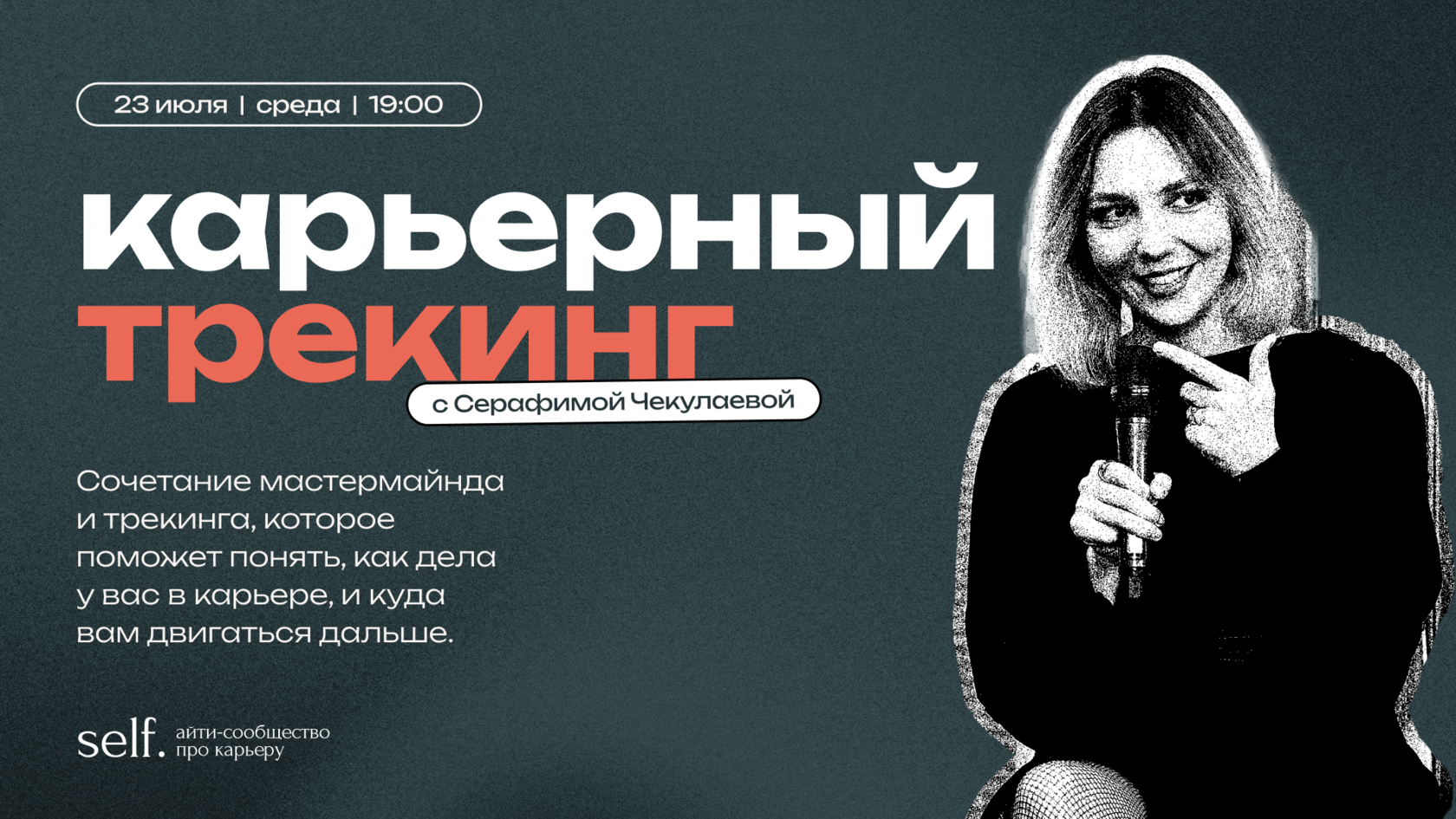 Воркшоп, как всегда, проводит Серафима Чекулаева, CEO self. Серафима раньше работала руководителем продукта в VK Музыке, Т-Банке и Яндексе, а сейчас она карьерный ментор, поэтому сможет оказать участникам воркшопа максимально квалифицированную поддержку.